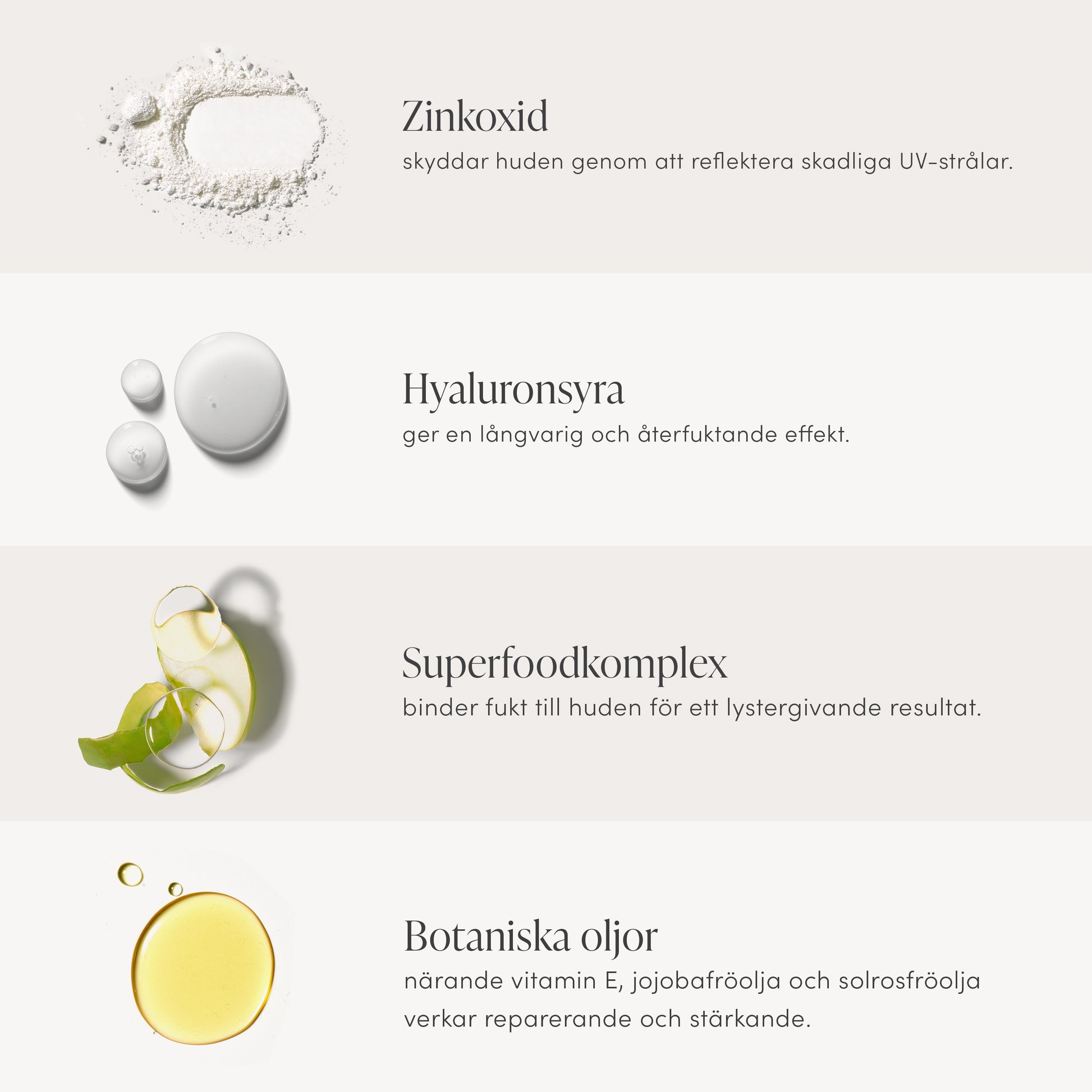 - Solrosolja och jojobaolja: Efterliknar hudens egen barriär. Reparerande, stärkande och milda för alla hudtyper